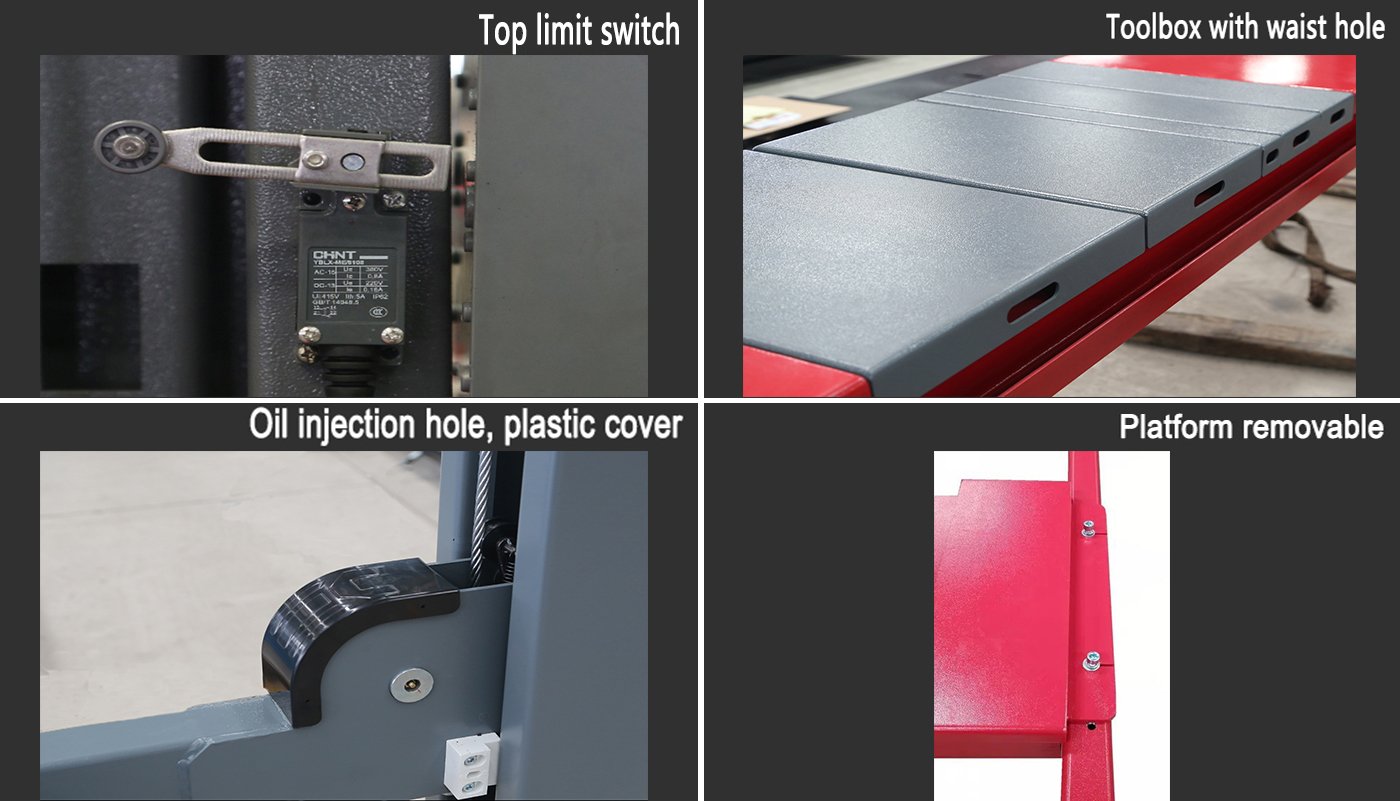 3.Hydraulic cylinder drive, rope drive, quiet and smooth lifting.